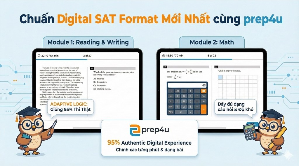 Có. Tất cả đề thi thử SAT Digital tại prep4u được xây dựng dựa trên cấu trúc và tiêu chuẩn của College Board, mô phỏng sát format Bluebook, đúng dạng câu hỏi và mức độ khó từng module.