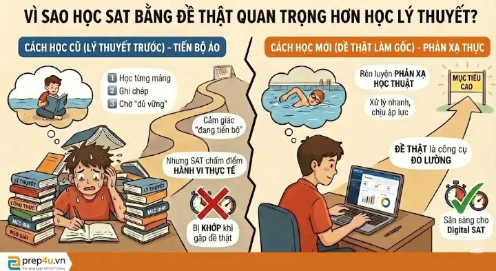 Học nhiều lý thuyết chưa chắc giúp tăng điểm SAT. Bài viết giải thích vì sao đề thật mới là công cụ giúp bạn học đúng và ra quyết định đúng.