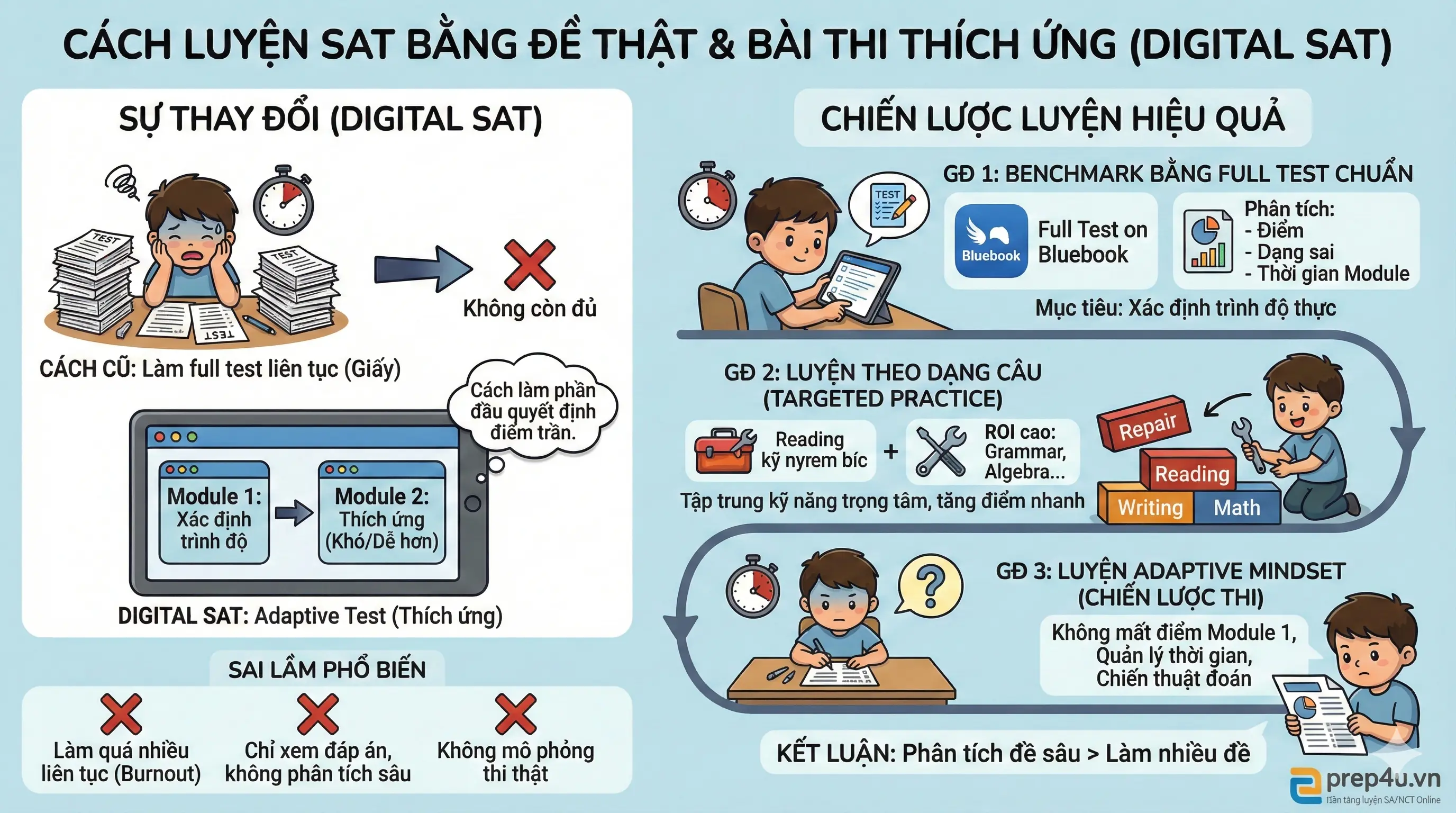 Cách luyện SAT bằng đề thật trong Digital SAT: benchmark, phân tích lỗi, luyện theo module thích ứng và chiến lược tăng điểm nhanh nhất. Hướng dẫn học thuật chi tiết.