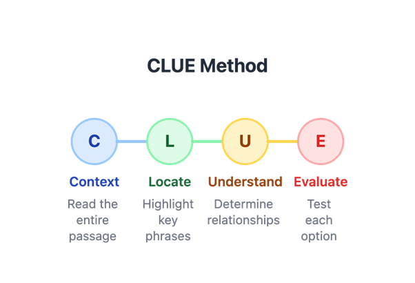 : To consistently solve Word in Context questions correctly, we've developed the CLUE method - a systematic four-step approach that will guide you to the right answer every time. C stands for Context: carefully read the entire passage, not just the sentence containing the blank. Pay attention to the overall tone, purpose, and main ideas to establish a framework for understanding. L stands for Locate: identify and highlight key phrases that provide clues about the missing word's meaning. Look for defining phrases, examples, contrasts, or synonyms that clarify what the blank represents. U stands for Understand: determine the relationship these clues have with the blank - are they defining it, contrasting with it, providing examples, or establishing cause and effect? This step helps you determine what function the word in the blank needs to serve. E stands for Evaluate: test each answer choice in the blank to see which one best maintains the meaning established by your analysis. Eliminate options that change the meaning or don't align with your context clues. Let's apply this method step-by-step to some practice questions to see how it works.