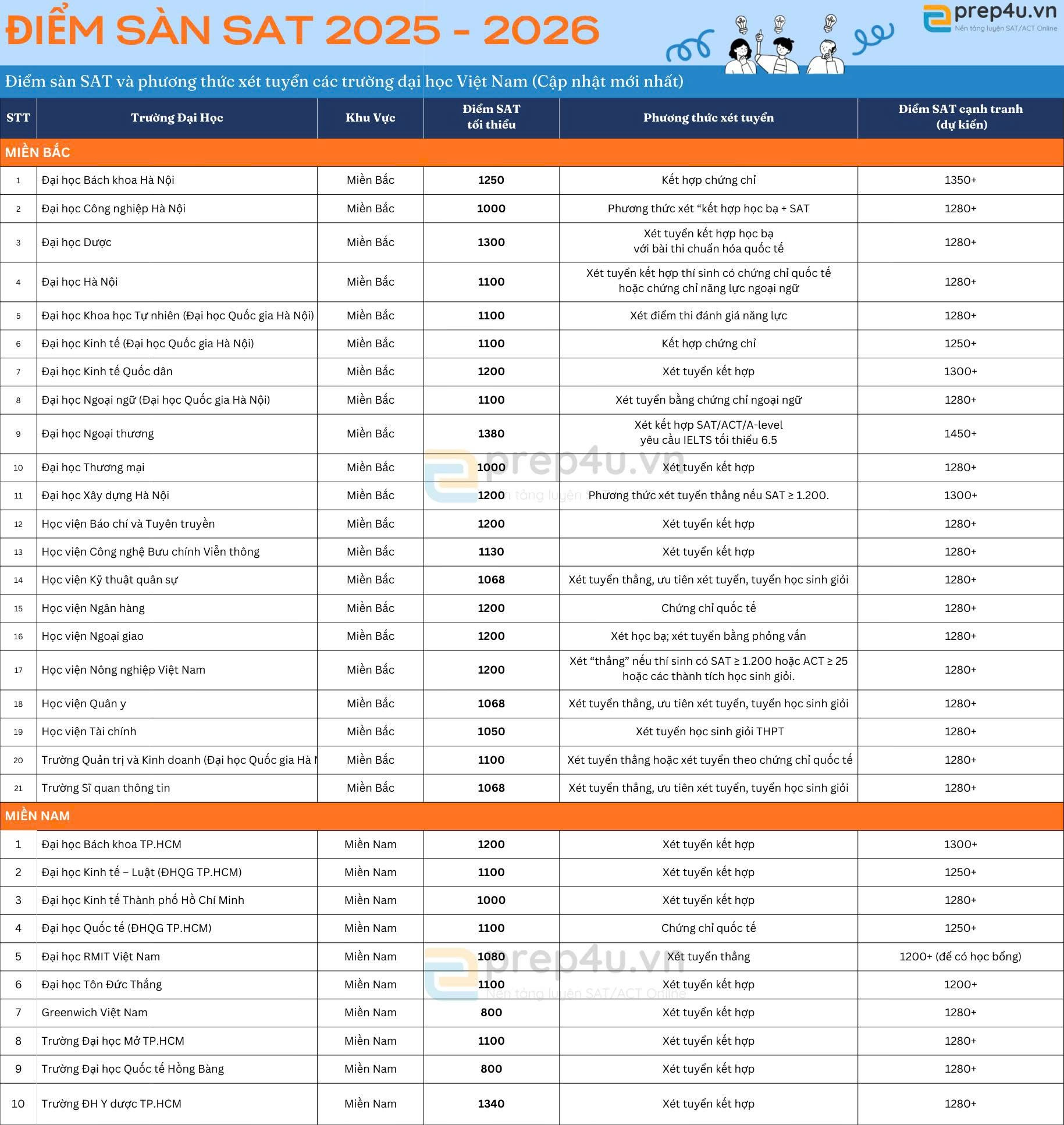 Năm 2025, nhiều trường đại học hàng đầu Việt Nam sử dụng chứng chỉ SAT để xét tuyển, hoặc cho phép thí sinh cộng điểm ưu tiên, khuyến khích.