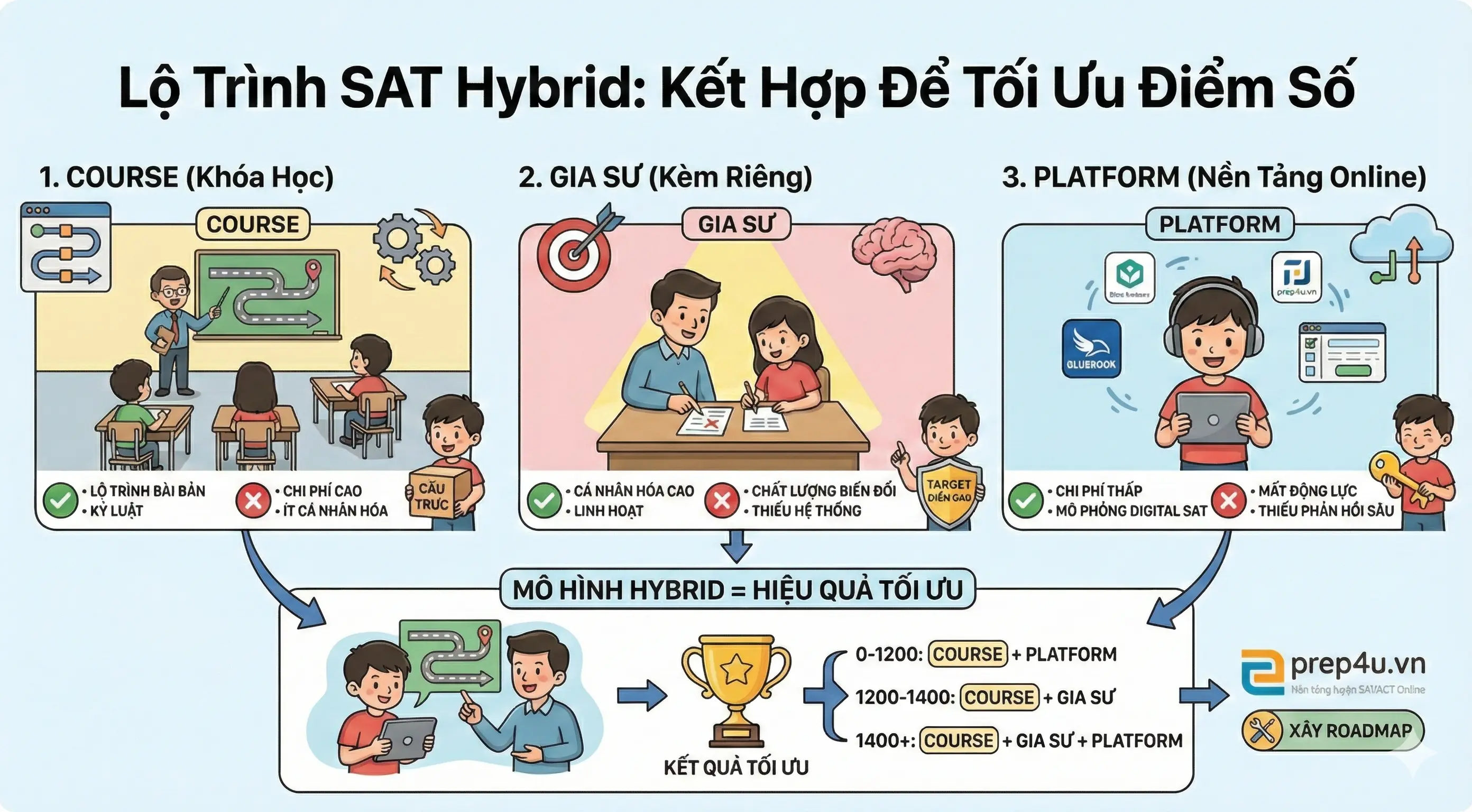 Tuy nhiên, không có một phương pháp luyện SAT duy nhất phù hợp cho tất cả học sinh. Hiện nay, ba mô hình phổ biến nhất gồm: khóa học (Course), gia sư cá nhân (Tutor), và nền tảng tự học (Platform). Mỗi mô hình có ưu điểm, hạn chế và phù hợp với từng nhóm người học khác nhau.
