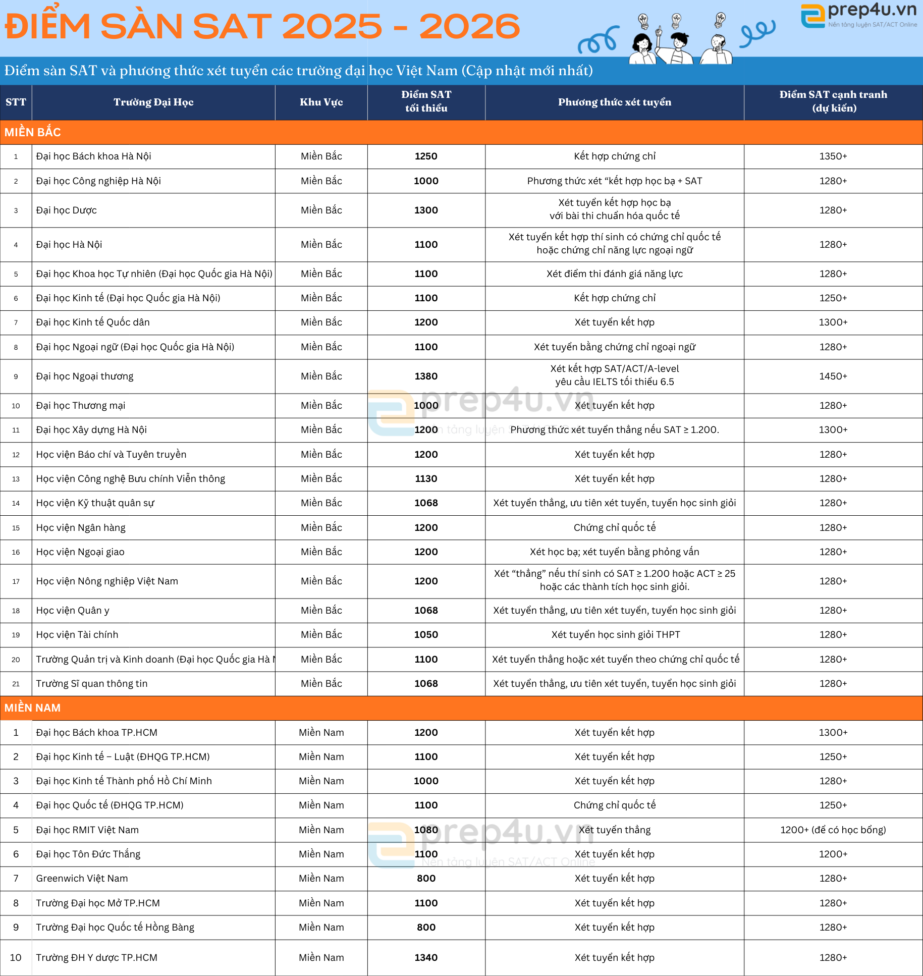 Tổng hợp mới nhất điểm SAT xét tuyển của các đại học top Việt Nam như FTU, NEU, BKA, VinUni… Kèm gợi ý mức điểm an toàn cho từng trường.