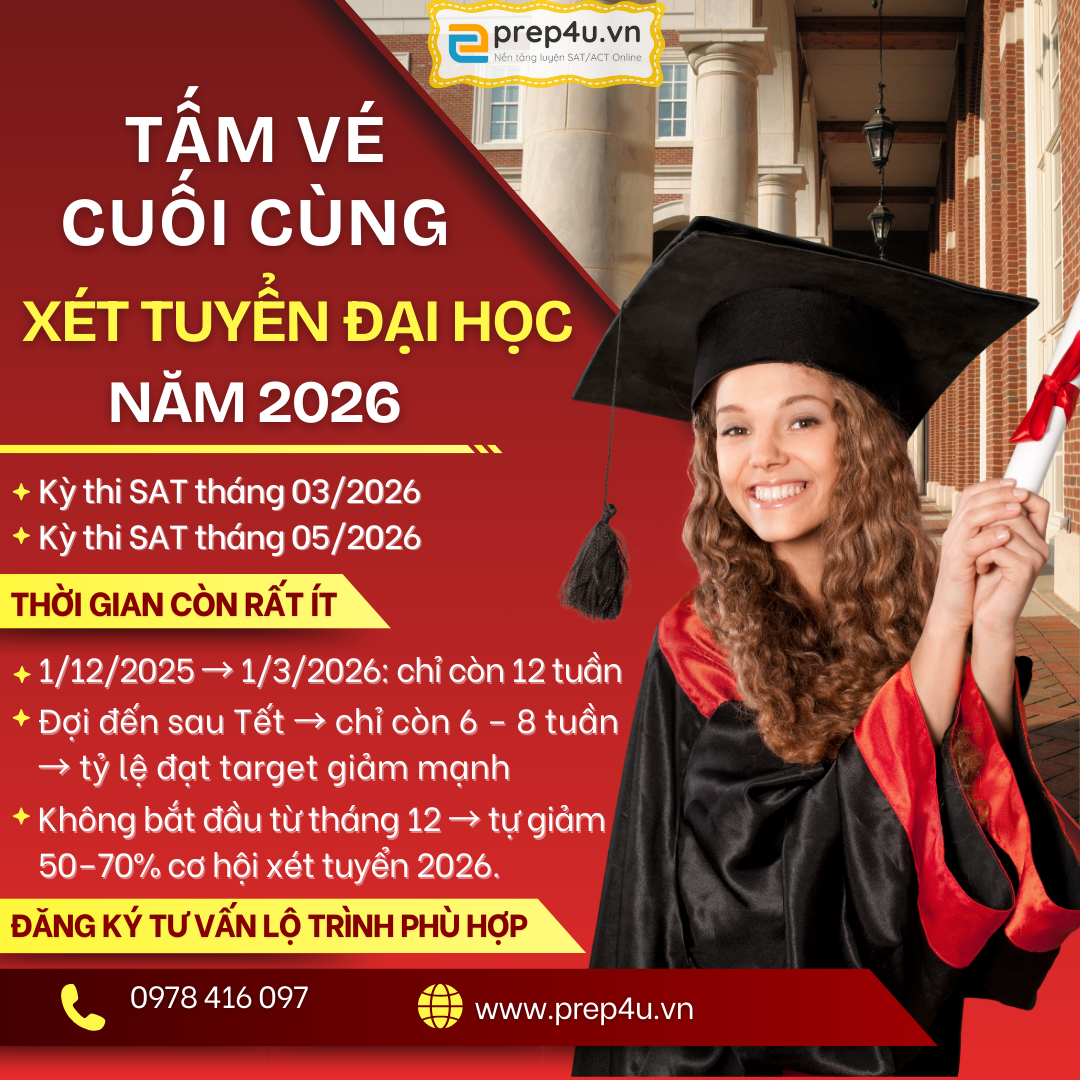 Tháng 3 & 5/2026 là hai kỳ SAT cuối có giá trị xét tuyển tại nhiều đại học top Việt Nam. Xem lý do, deadline và cách tối ưu điểm trước hạn.
